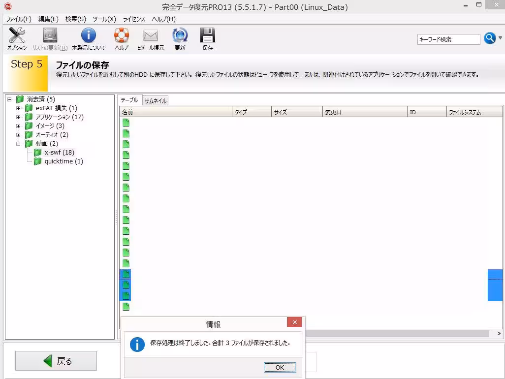 そして、「ファイルの保存」の画面で、検出できた分の消去済みだったデータが、
