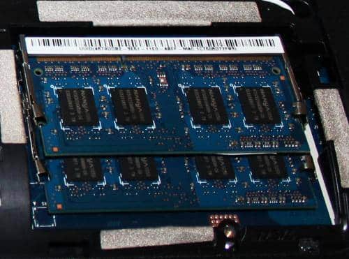 ハードディスクドライブや無線LANカードとともに、メモリモジュールが収納されています。