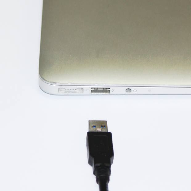 MacBook AirのノートPCに、USBケーブルのコネクタを差し込みます。