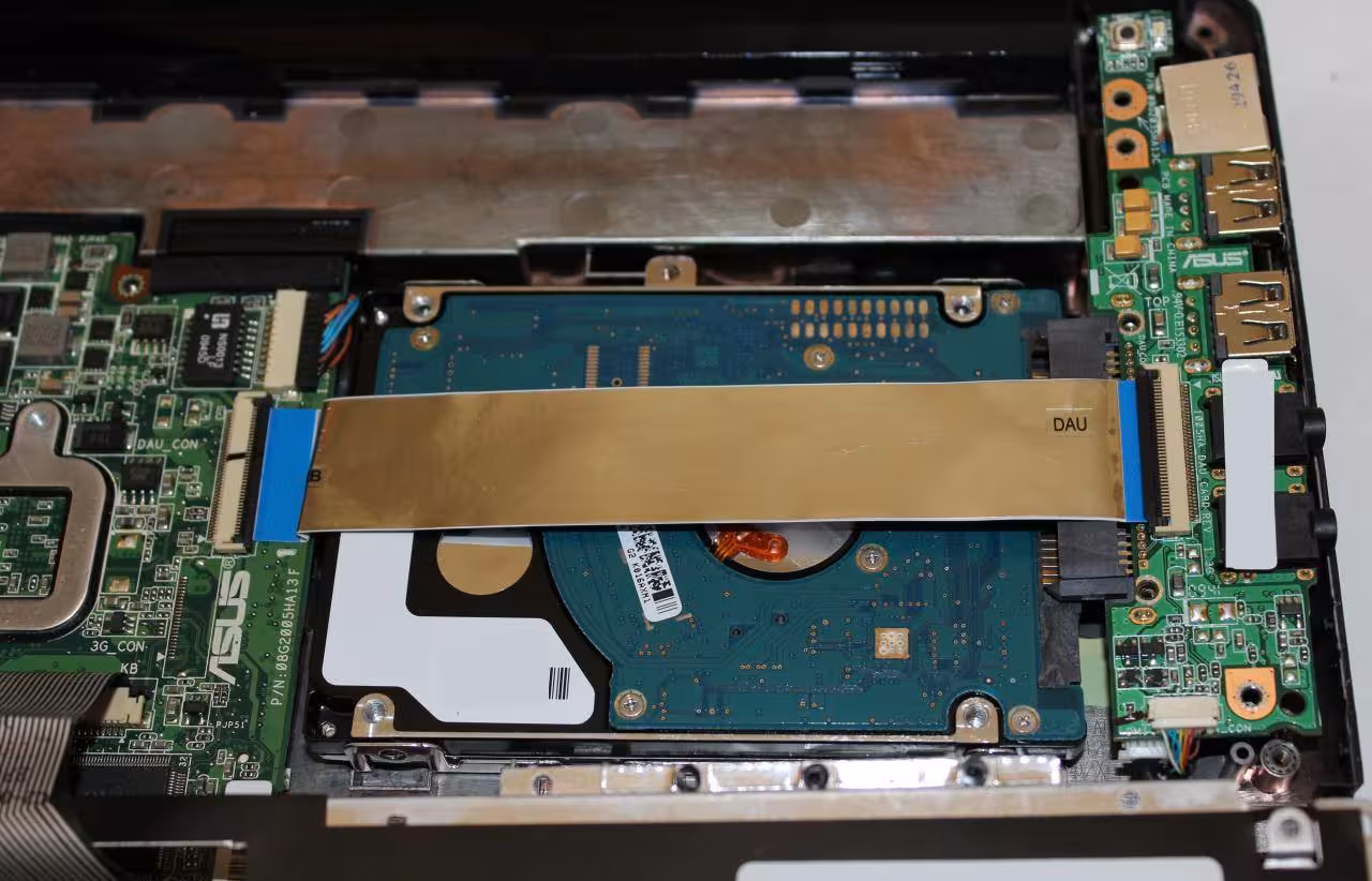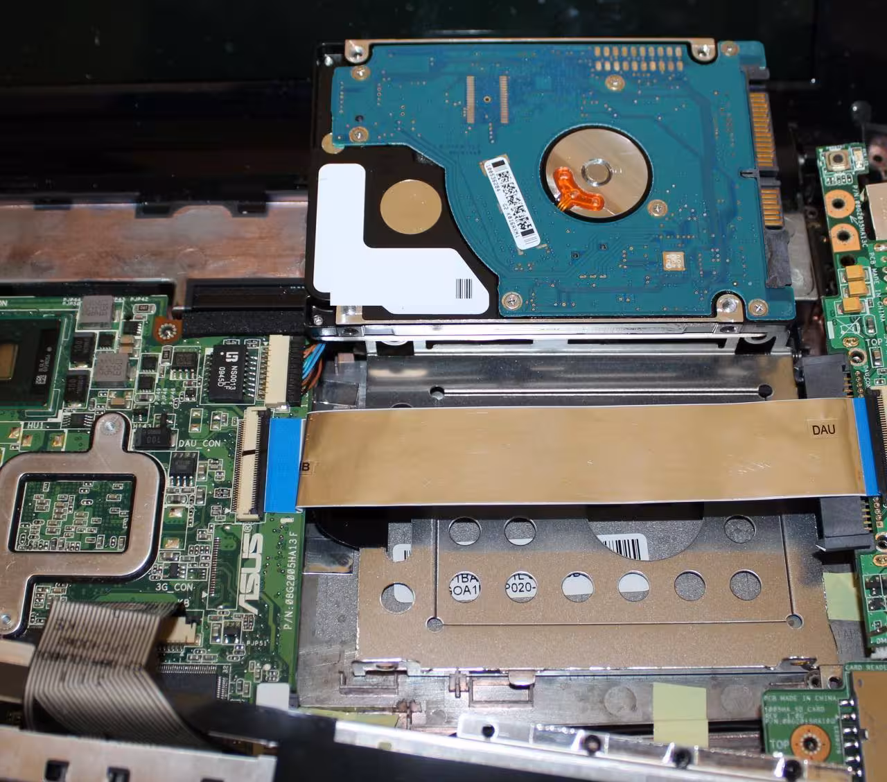 キーボードと下の金属パネルを取り外したらその真下に、サルベージをしたいデータが保存された2.5インチ型のハードディスクが、