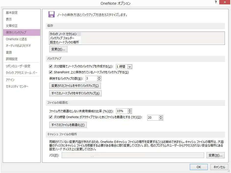 「OneNoteオプション」の画面で、「保存とバックアップ」の項目を開きます。