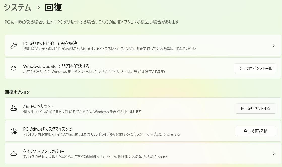 Windows11を丸ごと初期化(リカバリー)して、設定を一度まっさらにする対処のやり方もあります。