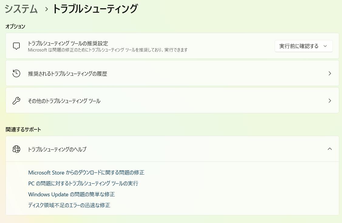 「システム」→「トラブルシューティング」(Troubleshooting)と進んでください。
