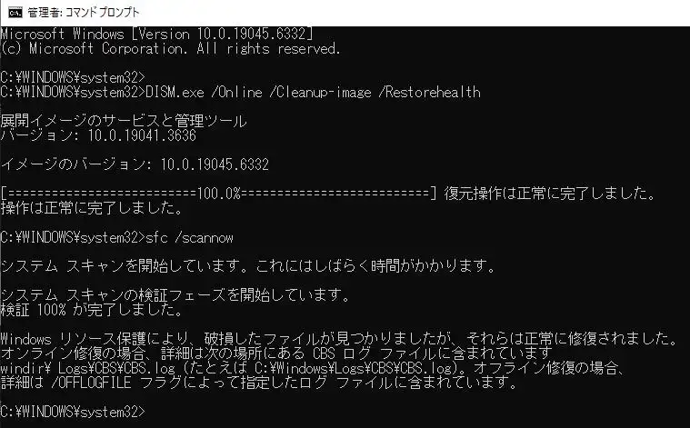 Windowsのシステムファイルチェッカーにある、復元のコマンドが実行されます。